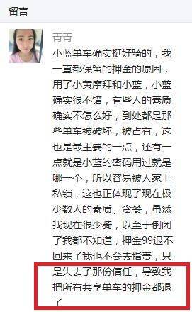 欺骗、违法,酷骑和小蓝让很多单车用户伤透了心。据北京晨报报道,已经有用户采取“随骑随押,骑完即退”的方式降低风险。就像本文开头提到的小故事,类似的质疑已经比较普遍,波及摩拜和ofo。