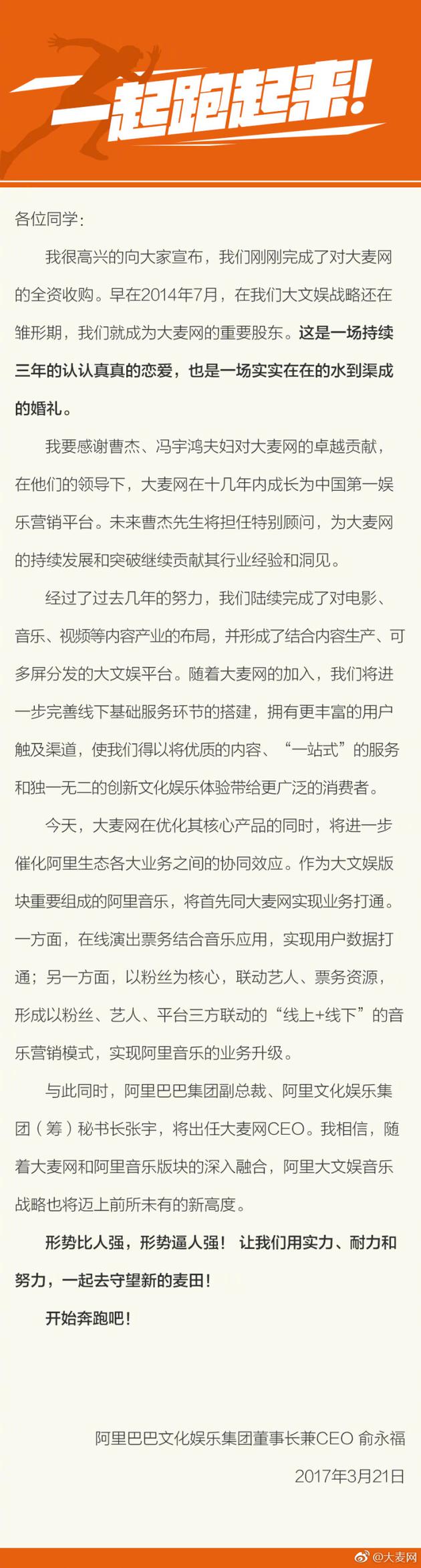 阿里巴巴文化娱乐集团董事长兼CEO俞永福发表内部信称,早在2014年7月,在阿里大文娱战略还在雏形期,就成为大麦网的重要股东,将此事称为“一场持续三年的认认真真的恋爱”。