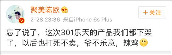 2月28日晚,聚美优品CEO陈欧在微博中发文称:“忘了说了,这次301乐天的产品我们都下架了,以后也打死不卖,爷不乐意,辣鸡”。