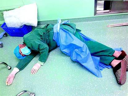 这几天,湖北孝感一名外科医生做完手术后睡倒在地板上的图片在微博和朋友圈火了。记者求证得知,照片中的男子是孝感市第一人民医院东城新院综合外科的朱传敏医生,当日,他连做几台手术后,几近虚脱,走下手术台就躺在地板上睡着了。
