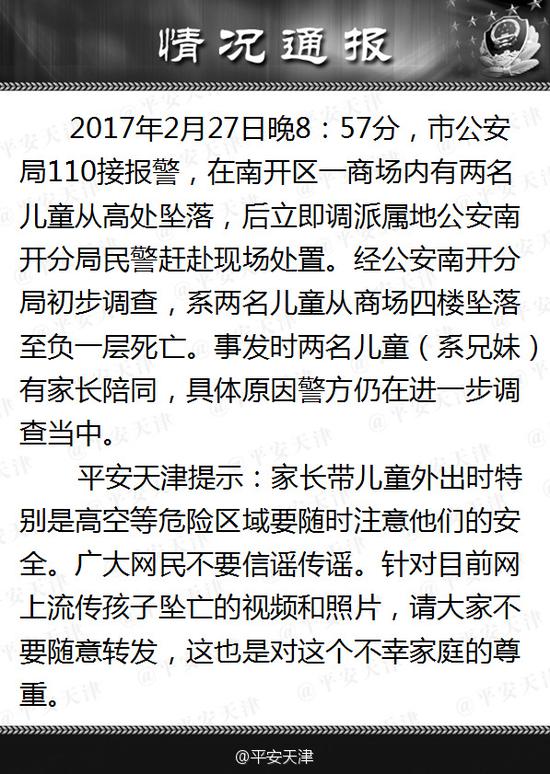 早前报道:妈妈没抱住 两孩子在天津大悦城坠楼
