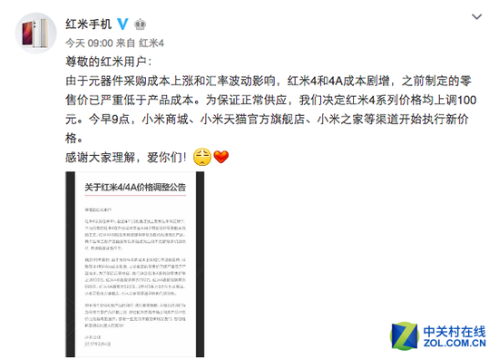 伴着一轮涨价潮,小米手机也按耐不住了。今天(2月4日)小米宣布,由于元器件采购成本上涨和汇率波动影响,红米4和4A成本剧增,之前制定的零售价已严重低于产品成本。两款手机均在原有价格基础上涨价100元,现在红米4、红米4A起步售价分别为799元、599元。
