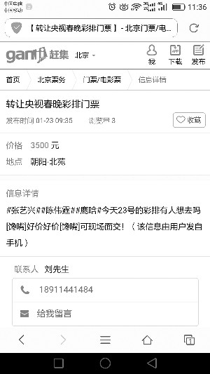 昨天,记者在58同城、闲鱼等多家网络平台上看到有人出售春晚彩排门票。在赶集网上搜索“春晚彩排门票”,页面上会跳出六七条相关帖子。其中一则“转让央视春晚彩排门票”的帖子,提示当红明星鹿晗、张艺兴彩排等信息,标注的价格为3500元。