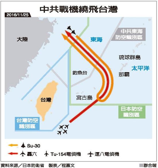 早前台媒报道,中国大陆军机包括2架轰-6K长程轰炸机、1架图-154型电子作战侦察机、1架运-8电子侦察机及2架苏-30战机进行机队远航训练,其中4架军机经由台湾南部,经巴士海峡,绕行台湾进行飞行训练,并在日本宫古海峡上空集结,共同飞返中国。