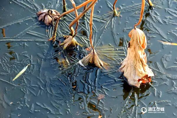 1月21日,西湖平湖秋月荷塘出现今冬首次结冰。(来源:浙江在线)